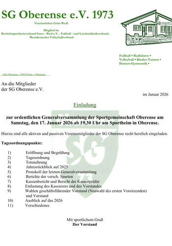 Die SG Oberense ist ein eingetragener, gemeinnütziger Sportverein, der 1973 gegründet worden ist. Sein geschäftsführenden Vorstand wird zur Zeit von Klaus Ebel und Frederik Schlösser (beide 1. Vors.), Manuel- Danne-Rasche (2. Vors.) und Sabine Baukmann (Geschäftsführerin) gebildet. Wie der Name unschwer erkennen lässt, haben sich in dem Verein interessierte Leute zusammen gefunden, die gemeinsam Fußball, DART, Radsport, Aerobic betreiben wollen